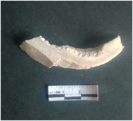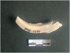 | Description / विवरण | This is a shell circlet fragment with two broken ends. Unfinished and unpolished with cut edges. Possibly either it is a raw material or waste product in the manufacturing unit. |
