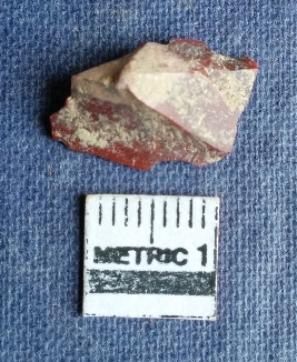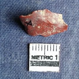 | Description / विवरण | This is a flake of jasper with flaked ridges and bulb of percussion seen on one corner, marronish with a white band in color. |