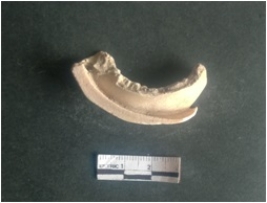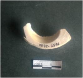 | Description / विवरण | This is a shell circlet fragment with two broken ends. Unfinished and unpolished with cut edges. Possibly either it is a raw material or waste product in the manufacturing unit. |