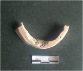 | Description / विवरण | This is a shell circlet fragment with two broken ends. Unfinished and unpolished with cut edges. Possibly either it is a raw material or waste product in the manufacturing unit. |