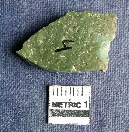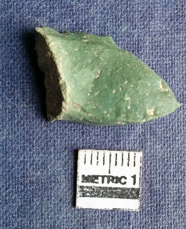 | Description / विवरण | This is a flat flake of chert stone, tarquiz blue in color, bulb of percussion seen on one side, cortex at one end and with flaked ridges. |