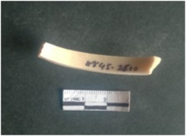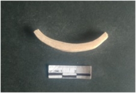 | Description / विवरण | This is a shell circlet fragment with two broken ends. Unfinished and unpolished with cut edges. Possibly either it is a raw material or waste product in the manufacturing unit. |