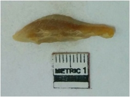 | Description / विवरण | It is a chalcedony flake with negative flake scars and sharp ends. |