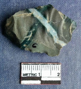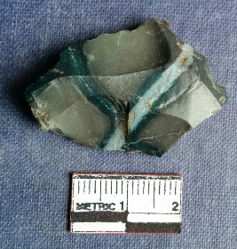 | Description / विवरण | This is a flattish fragment of jasper with flaked ridge marks all over the surface, white silicious band through the middle of the flake, vendral side ripples seen on the ridged surface. |