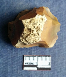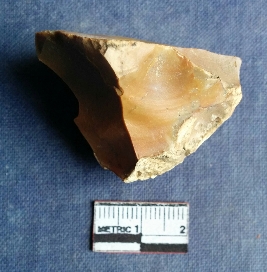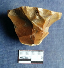 | Description / विवरण | This is a chert stone fragment with small portion of calcified cortex, flakes had been removed from all sides, sharp edges ridges with bulb of percussion seen. |