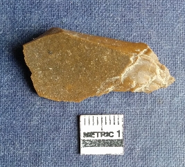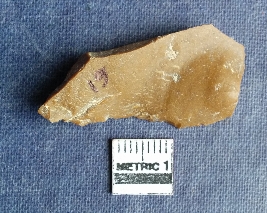 | Description / विवरण | This is a chert stone flake, irragular shaped, yellow ochre in color, there is a prominent bulb of percussion with a striking platform, sharp flaked ridges. |