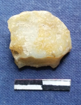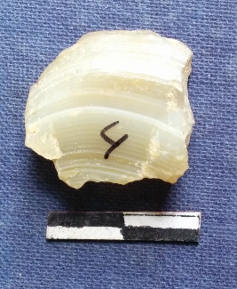 | Description / विवरण | This is a banded agate with one side covered with cortex, transluscent with beautifully white band formation. |