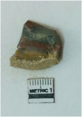 | Description / विवरण | Jasper is a cryptocrystalline piece with cut edges as a result of flaking. |