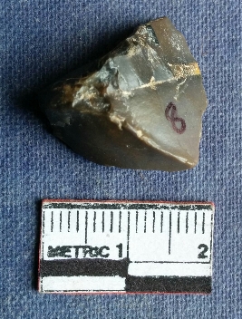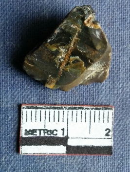 | Description / विवरण | This is a triangular shaped jasper fragment with flaked ridges. |