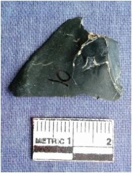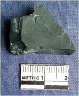 | Description / विवरण | The jasper flake is roughly squarish in shape with surfacial flake scars and a bulb of percussion. The edges are sharp with tapering ends on one side. |