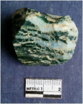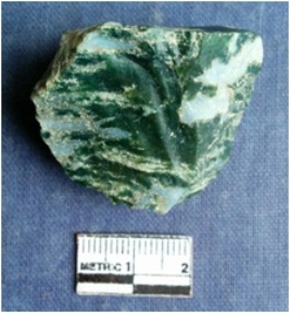 | Description / विवरण | The jasper chunk has sharp edges and clear flake scars. The piece is chunky with green and white bands. |