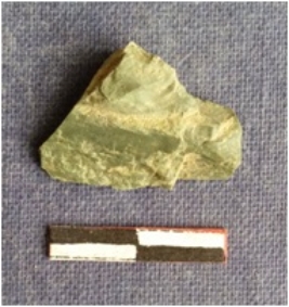 | Description / विवरण | The jasper piece has sharp edges and a bulb of percussion owing to flake detachement from the core. The sides as sharp and surface has numerous flake scars. |