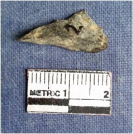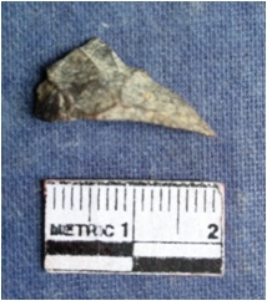 | Description / विवरण | Sharp chert piece with a prominent median ridge and a positive bulb of percussion. |