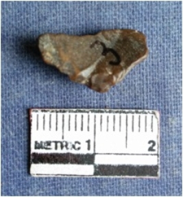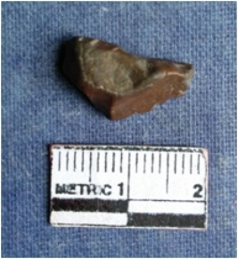 | Description / विवरण | Small triangular flake with rounded edges and flake scars on the surface. |