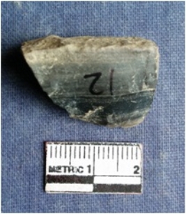 | Description / विवरण | The chunk of schist has a clear cortex. A flake scars on the surface. |