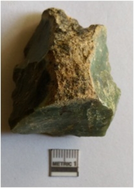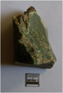 | Description / विवरण | The jasper flake has a backed end sharp edges as a result of flaking. The piece has cortex on the unflaked part. |