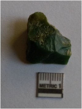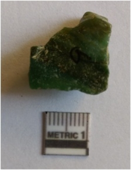 | Description / विवरण | The jasper flake is irregularly shaped, with median flaked ridge and sharp edges. The surface has negative flake scars. |