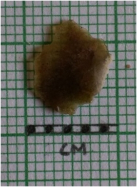 | Description / विवरण | Thin jasper flake, with sharp edges and thin section. due to flaking. |