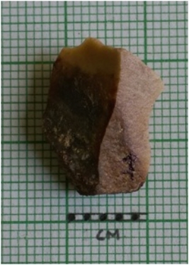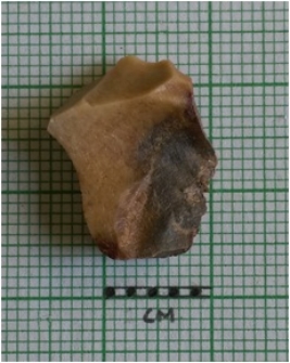 | Description / विवरण | The flake has a negative bulb of percussion and a median ridges due to flaking. |