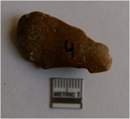 | Description / विवरण | The crypto - crystalline flake has tapering edges and grounded sides due to prolonged deposition. The piece has negative bulb of percussion pointing at flake detachment. |