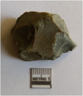 | Description / विवरण | The chert flake has angular edges and flat section. The piece has negative flake scars on the surface and tapering edges. The piece has a triangular profile, with crypto - crystalline matrix. |