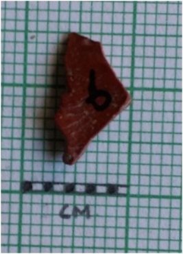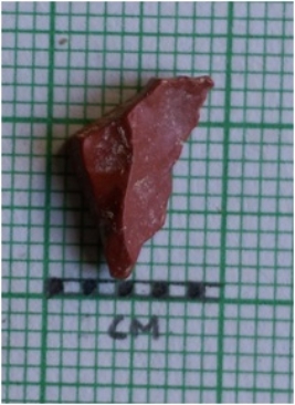 | Description / विवरण | The small rounded flake is roughly rectangular in shape, with angular edges and flat profile. The piece is rectangular in section and has flake scars on the surface. |