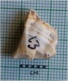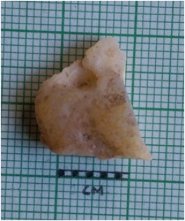 | Description / विवरण | The flake is rounded due to prolonged sedimentation. The piece has a shallow blue of percussion and sharp flaked edges. The flak scars are visible on the surface, and pointed ends as a result of breakage are seen on the piece. |