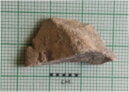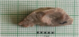 | Description / विवरण | The chert flake is dull colored with surfacial flake scars and transverse flaking. |