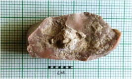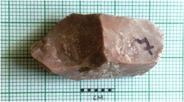 | Description / विवरण | The chert flake is dull colored with surfacial flake scars and transverse flaking. |