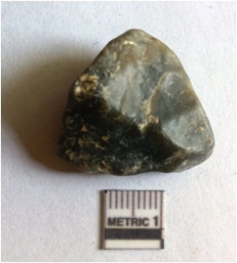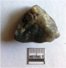 | Description / विवरण | Jasper flake is dark in color and has median flaked ridge. The edges are sharp, with pointed ends as a result of flaking. |