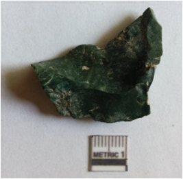 | Description / विवरण | Jasper flake is dark in color and has median flaked ridge. The edges are sharp, with pointed ends as a result of flaking. |