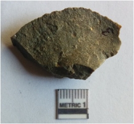 | Description / विवरण | The greenish chert piece has sharp edges due to flaking and a bulb of percussion. The ripple marks are visible on the surface. |