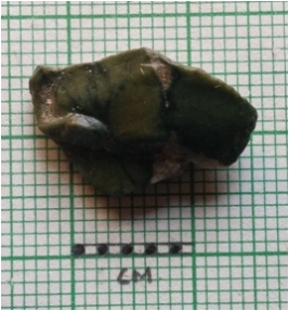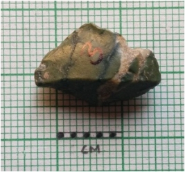 | Description / विवरण | The jasper piece is roughly square in shape, with angular edges and pointed ends. The piece has surfacial flake scars and sharp edges. |