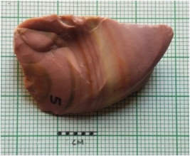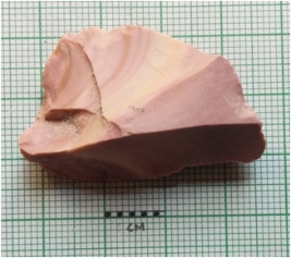 | Description / विवरण | The chert flake has a median ridge as a result of flaking. The piece has negative flake scars. The pink chert piece has natural bands due to chemical composition. It is a detached flake, as evidenced from fracture. |