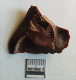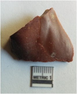 | Description / विवरण | The jasper flake has surfacial flake scars and sharp edges as a result of flaking activity. The piece has braked ends and truncated flaking. |