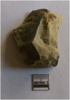 | Description / विवरण | Cuboid chert flake, with flaked surface and pointed ends. The piece is a retouched flake. |