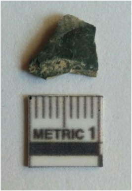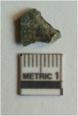 | Description / विवरण | The chert flake has a positive bulb of percussion and rounded edges, probably as a result of deposition. The flake has cut sides. |