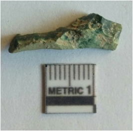 | Description / विवरण | The green colored jasper flake is with a sharp edge and a bulb of percussion. |