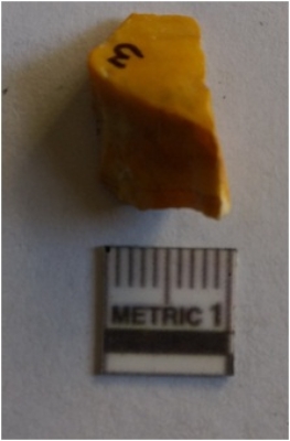 | Description / विवरण | The chert flake has clear flaked edges and flake scars on the surface. The piece is crypto - crystalline, with pointed ends and sharp but slightly rolled edges. |