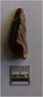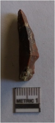 | Description / विवरण | The chert flake has clear flaked edges and flake scars on the surface. The piece is crypto - crystalline, with pointed ends and sharp but slightly rolled edges. |