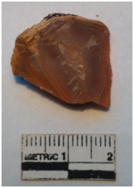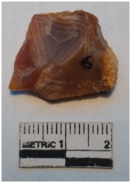 | Description / विवरण | It is a banded agate, portion of the cortex on one end of the flake with sharp lateral margins and flake scars on the surface. |