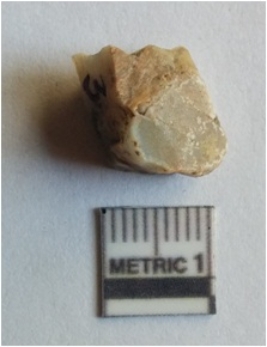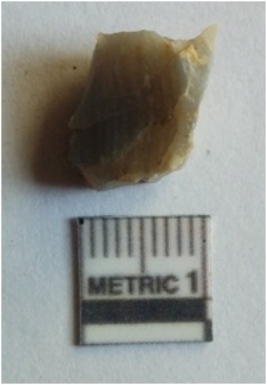 | Description / विवरण | Banded agate piece cuboidal in shape, with pointed end. Angular sides as a result of flaking. |