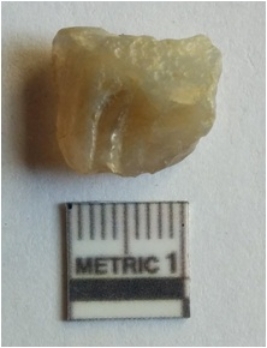 | Description / विवरण | Roughly cuboided chunk with angular edges and flake scars on the surface. Truncated ends as a result of flake detachment. |