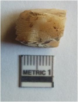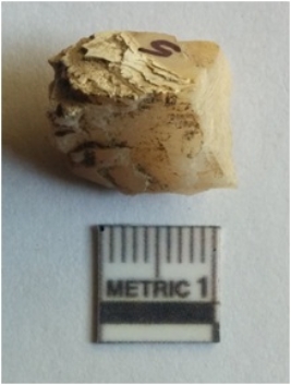 | Description / विवरण | Roughly cuboided chunk with angular edges and flake scars on the surface. Truncated ends as a result of flake detachment. |