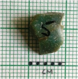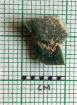 | Description / विवरण | The green chert flake has a characteristic triangular shape with a shallow bulb of percussion. The sharp edges and pointed ends are due to lithic knapping. |