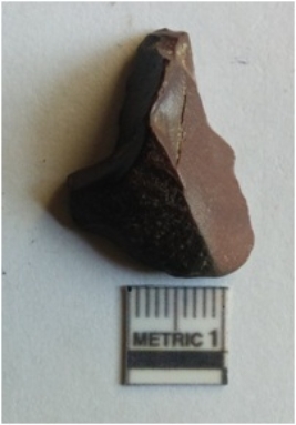 | Description / विवरण | Flake with negative bulb of percussion, pointing at secondary flake detachment pointed end and ridges as a result of flaking. |