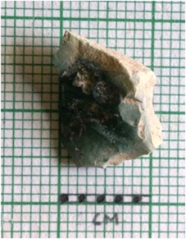 | Description / विवरण | The green chert flake has a characteristic triangular shape with a shallow bulb of percussion. The sharp edges and pointed ends are due to lithic knapping. |