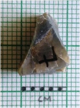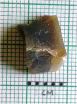 | Description / विवरण | The jasper flake has a shallow bulb of percussion and edges due to flaking. The deep colored flake has a median ridge due to flaking. The flake has angular edges and sharp pointed ends. |