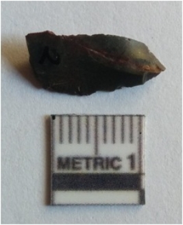 | Description / विवरण | The jasper flake has sharp end and flaked sided. A bulb of percussion is visible on the ventral side of the flake. |