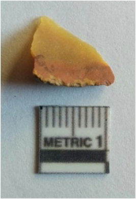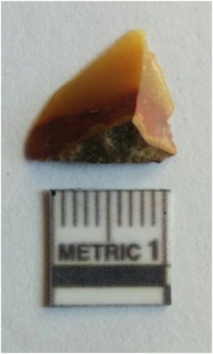 | Description / विवरण | Chalcedony flake has cortex on one end and another end is sharp with a ridge as a result of flaking. |